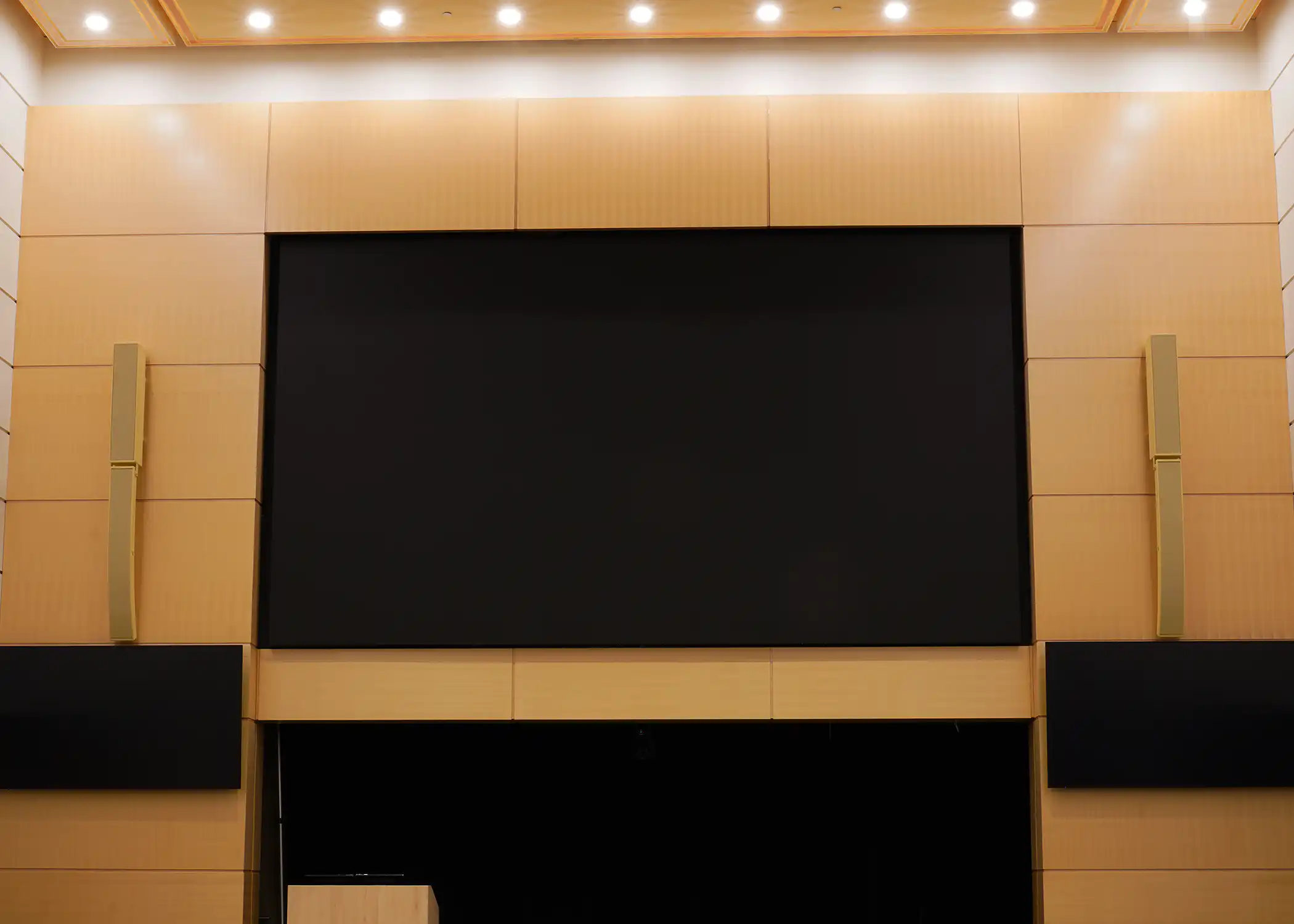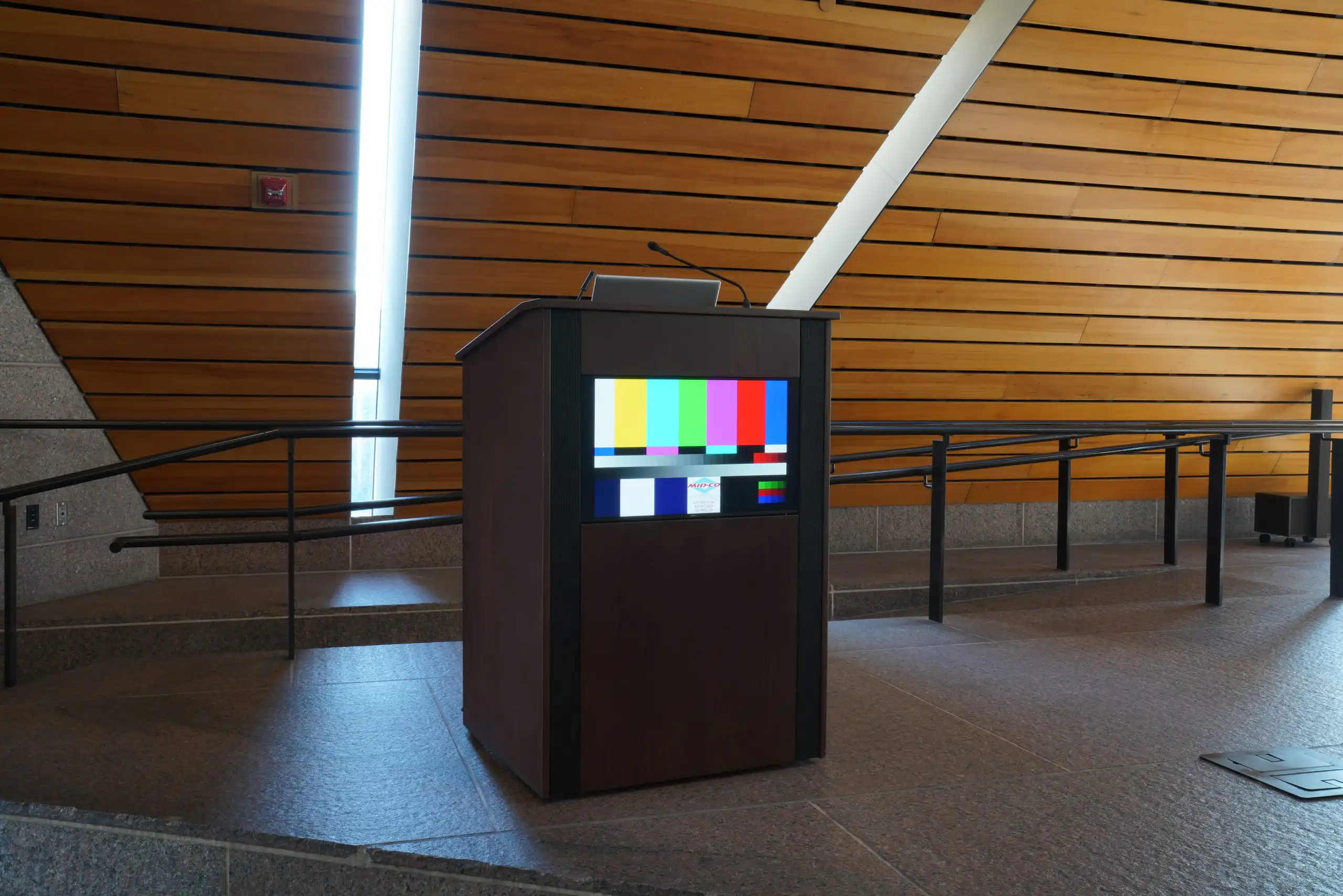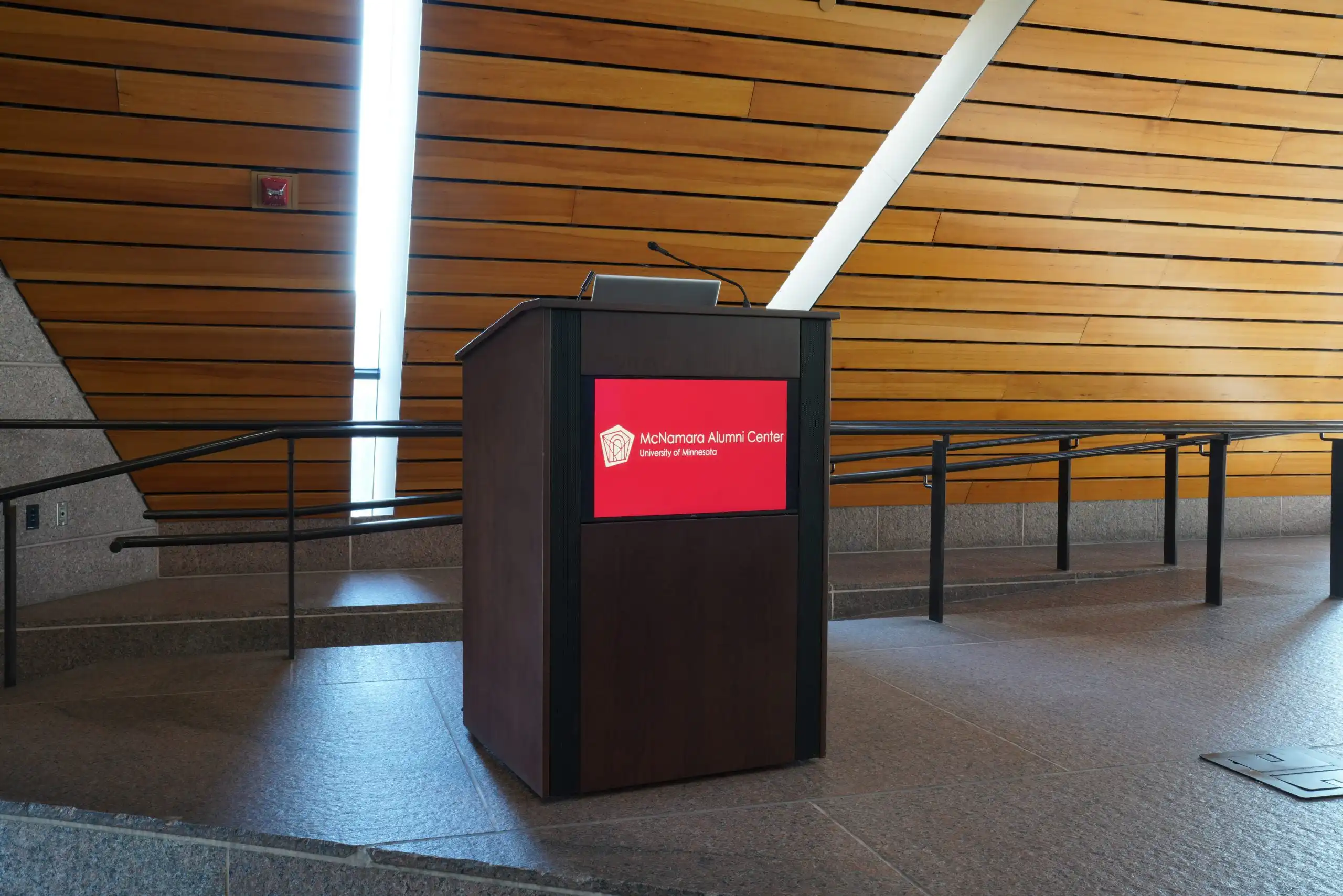 A custom built lectern, built by Innovox for the U of M McNamara Event Center. It features our SLA Micro Line Array with ribbon based tweeters and a cleverly disguised dipole spaced, slot loaded LF. It also has a built in LED display so any image, logo can be displayed.